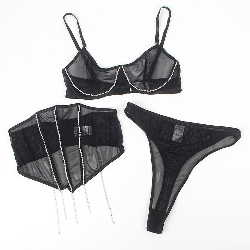 Shine with confidence in the Diamond Desire Ultra-Thin Mesh & Chain Bra Set. This daring three-piece lingerie design features transparent mesh stitching paired with sparkling diamond chain accents that exude glamour and seduction. Designed to highlight your curves with elegance, it’s the ultimate outfit for making an unforgettable impression.