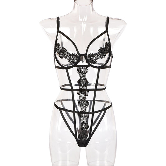 Unleash your bold sensuality with the Halter Neck Lace Bodysuit with Revealing Breast Perspective Tape. This sexy lingerie suit features a halter neck, seductive lace fabric, and strategically placed perspective tape that enhances and exposes the bust. The suspender design adds an erotic flair while soft, stretchable materials ensure comfort...