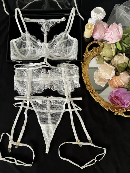 Unveil your inner charm with the Pure Desire Lace Cross-Tied Bow Lingerie Set. This enchanting ensemble features a delicate lace bra adorned with cross-tied bows, a matching thong, and a seductive garter belt. The black and white color scheme adds a timeless elegance, while the lace fabric offers a soft...