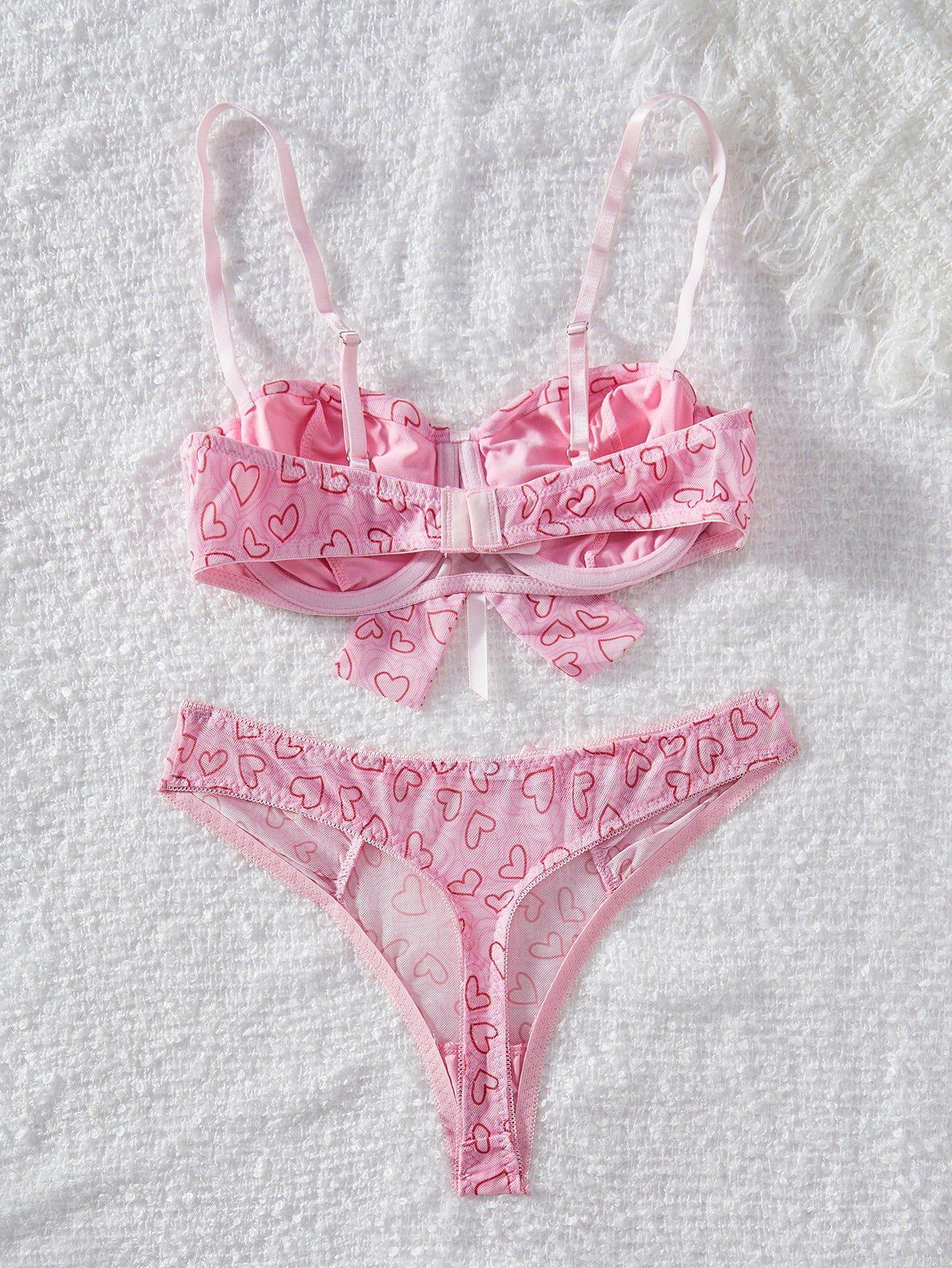 Heart Print Spaghetti Strap Push-Up Bra Set – Sexy Two-Piece Lingerie for Women