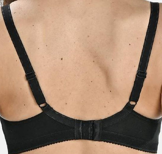 This black cotton nursing bra is designed for breastfeeding mothers who want comfort, support, and style in one piece. The cups are made from 100% soft cotton, while the sides contain Lycra fiber for a flexible, figure-hugging fit. With an underwire and higher bridge, it provides gentle lift and full...