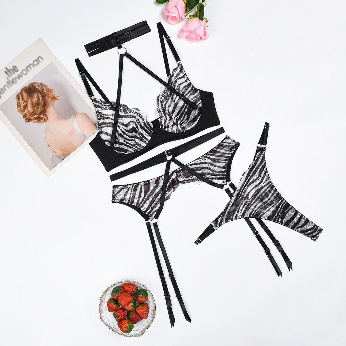 Unleash your wild side with the Wild Zebra Stripe Lingerie Set. Featuring a daring split design, cross neck ring detail, and bold zebra stripes, this three-piece set is made to...